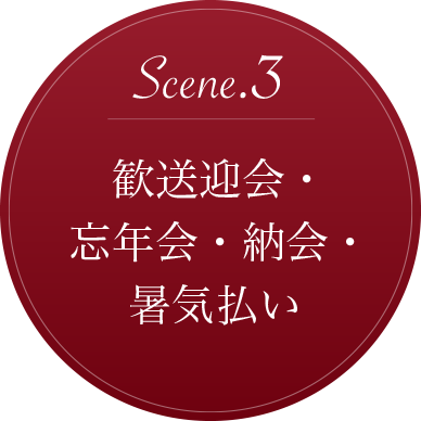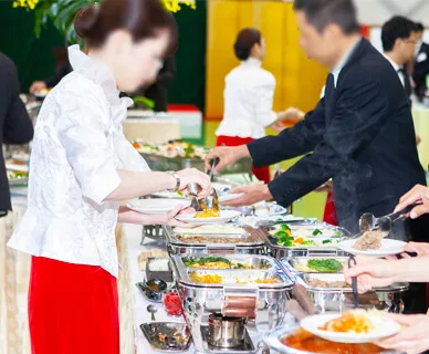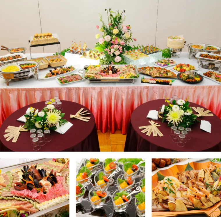 大皿料理が主体で多人数でのパーティーにも対応、お一人様ご予算を押さえながらも空間、テーブルを 華やかに演出。。LIVEフードでのかけ合わせも相性抜群です。和・洋・中を取り揃え、デザートも入り 充実したメニュー構成。お客様を招待しての祝賀会では3,500 円~が一番多く使われております。