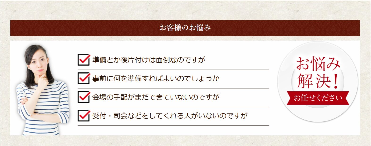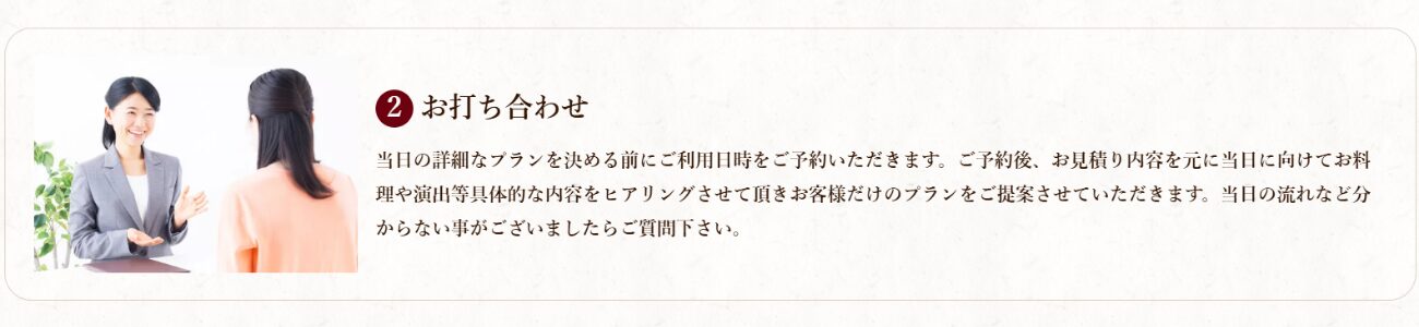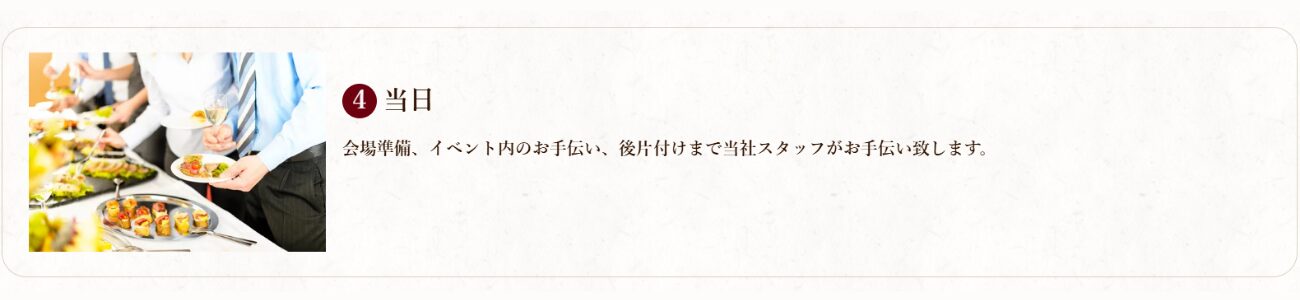 永年の実績と経験で立ち上げ段階からご担当者様と一緒に取り組みます。会場の大きさに合わせ何名様招待できるか、日にちの設定はいつにするか、パーティの進行はどうするかなど、立上げの段階からクリアしなければならない様々な課題をご担当者様と一緒に進めていきます。