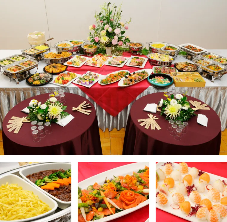 ビュッフェスタイルのため多人数の場合出席者数の8掛けでも十分対応できます。
