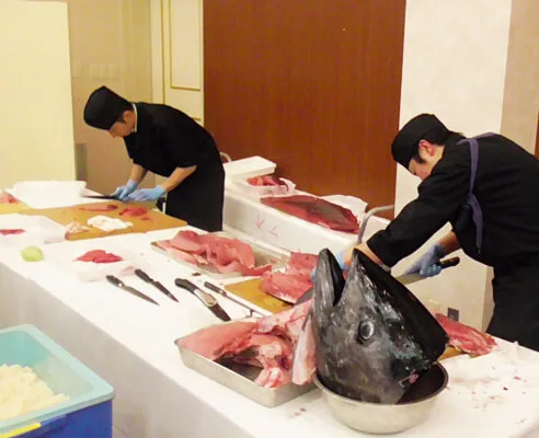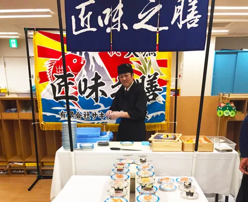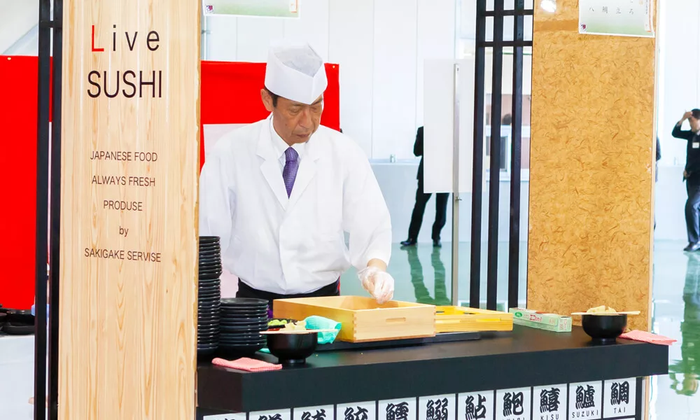 現地に寿司職人が出向いて握りたてのお寿司をお召し上がりいただけます。弊社オリジナル寿司屋台を設営しての演出はとても喜ばれております。