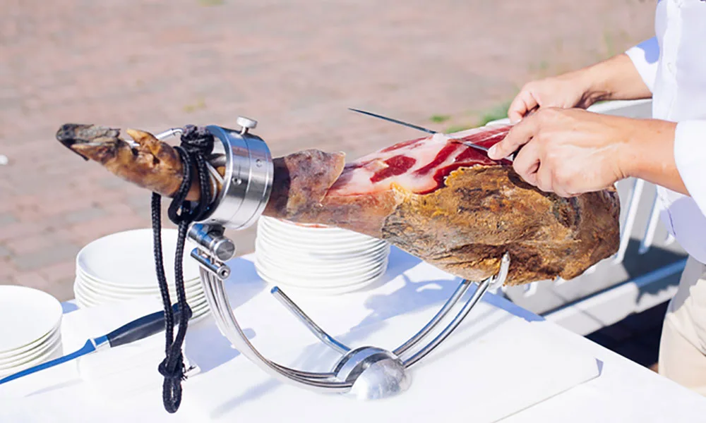 大きな生ハムの原木をシェフが1人前づつ切り分けてご提供いたします。本格生ホルダーを会場に設置いたします。